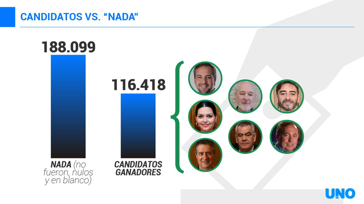 Por otra parte, 116.000 sufragios sumaron entre los 7 que ganaron este fin de semana, los seis nombres del peronismo y uno del oficialismo sancarlino. Aun si los juntamos a todos en la hipercoalición de los vencedores, la nada también les ganó.
