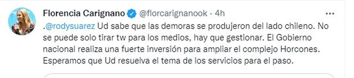 Serrano advirtió que las demoras no fueron en Horcones, sino en el complejo Los Libertadores, del lado chileno, por lo que el cuestionamiento de Suarez debió haber sido ante las autoridades de Chile. En el mismo sentido fue Florencia Carignano, la directora nacional de Migraciones, quien le pidió al mandatario mendocino que se ocupe de los servicios en la zona de frontera.