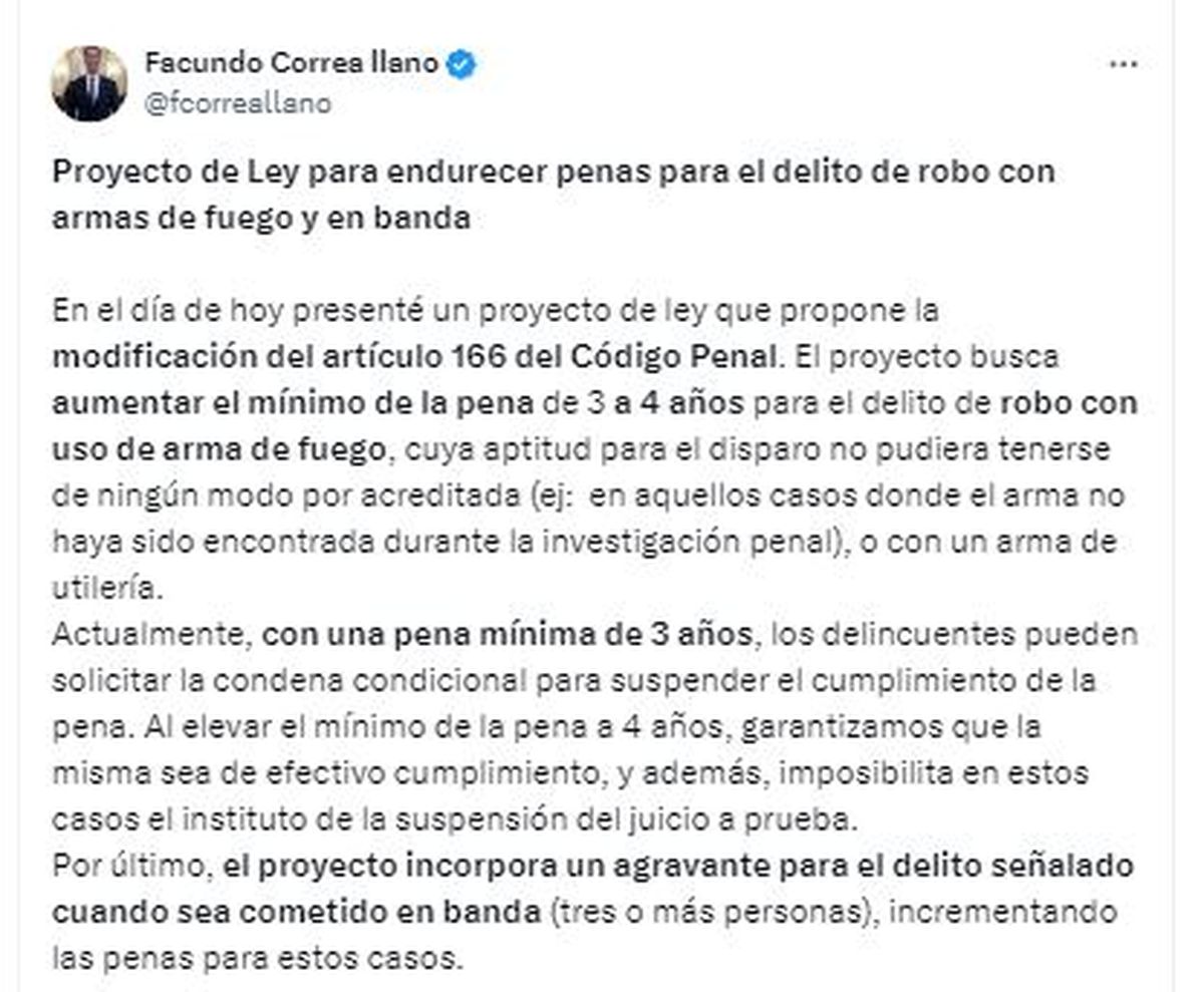 "El proyecto busca aumentar el mínimo de la pena de 3 a 4 años para el delito de robo con uso de arma de fuego cuya aptitud para el disparo no pudiera tenerse de ningún modo por acreditada (ej: en aquellos casos donde el arma no haya sido encontrada durante la investigación penal), o con un arma de utilería", amplió el legislador nacional en el posteo en el que contó su proyecto.