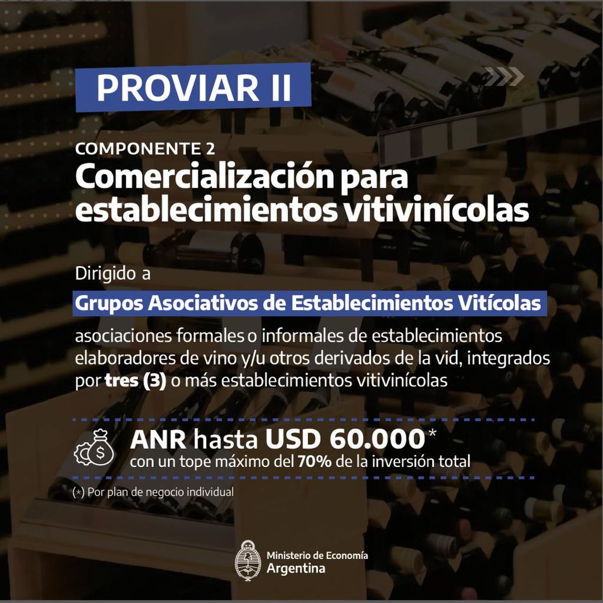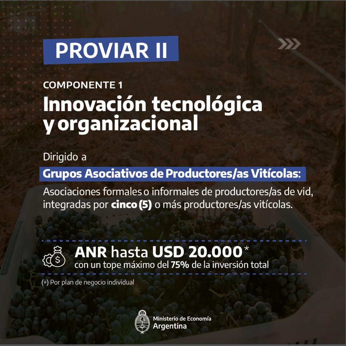 El componente uno -Innovación tecnológica y organizacional- está dirigido a grupos asociativos de productores vitivinícolas, el componente dos –Comercialización para establecimientos vitivinícolas- orientado a grupos asociativos de establecimientos vitivinícolas y el componente tres –Apoyo mipymes lideradas por jóvenes y mujeres- dirigido a emprendimientos de servicios vitivinícolas.