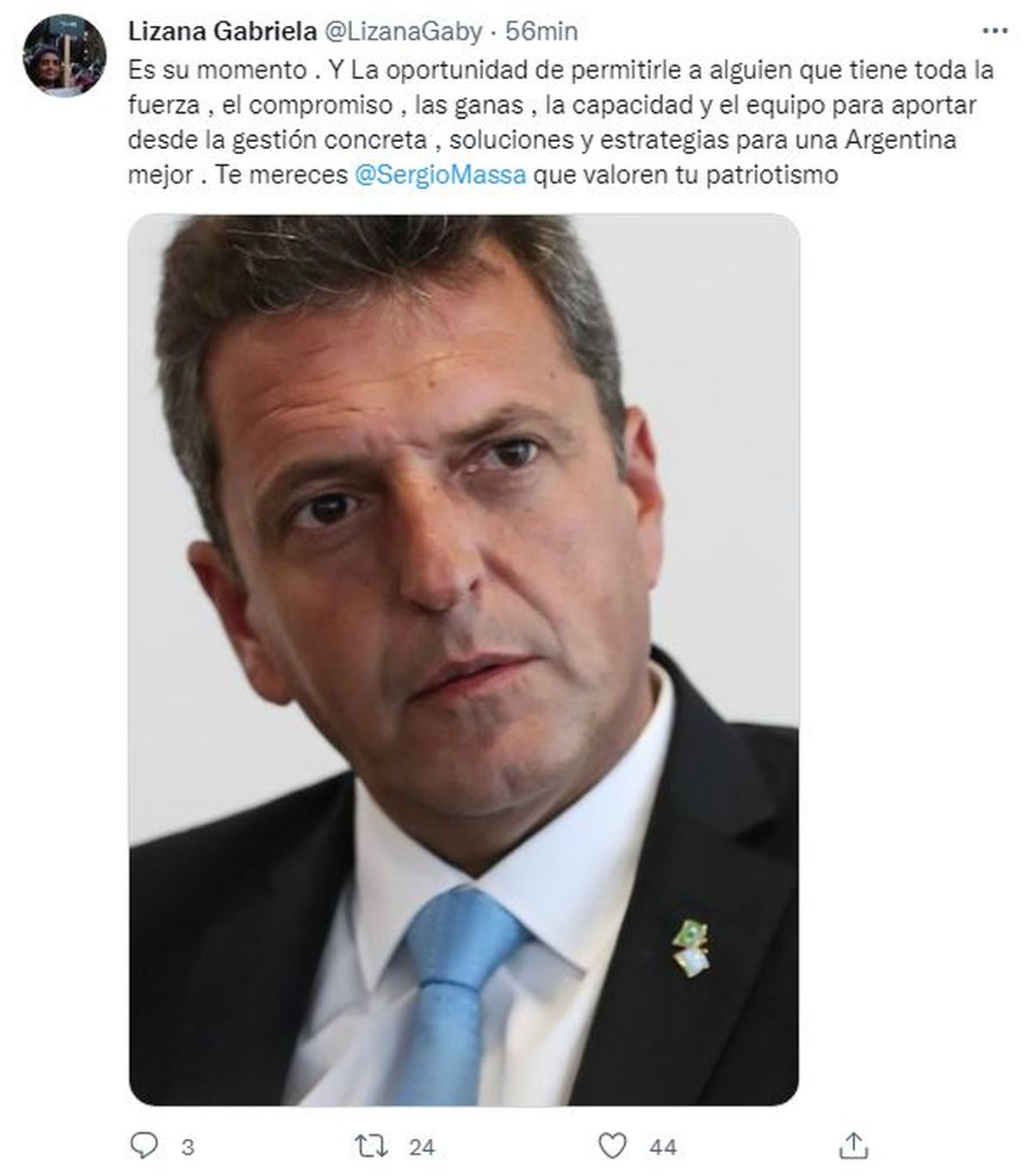 Tal es la ilusión que genera la cercanía de Massa al gabinete que la misma Lizana usó su cuenta de Twitter para marcar que "es su momento" y celebró la oportunidad de "permitirle a alguien que tiene toda la fuerza , el compromiso, las ganas, la capacidad y el equipo para aportar desde la gestión concreta, soluciones y estrategias para una Argentina mejor".