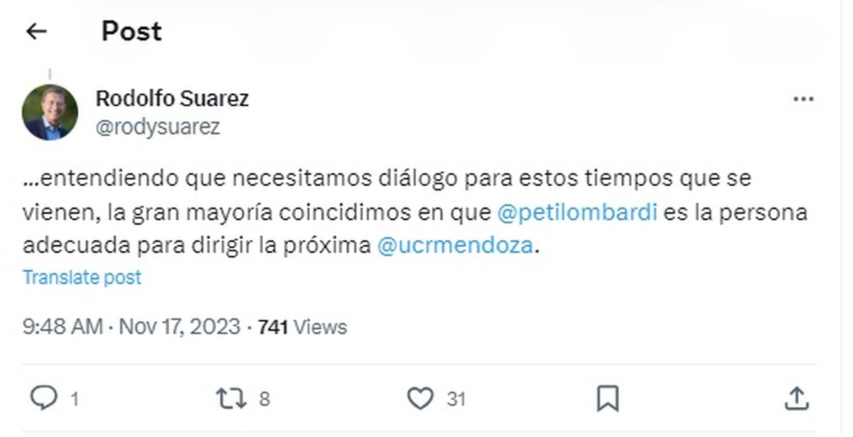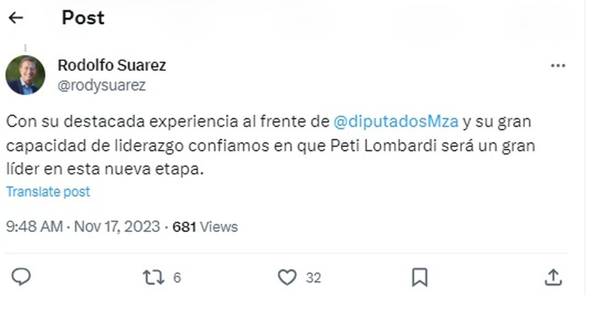En tanto, también desde su cuenta de X, Lombardi le respondió y agradeció a Rodolfo Suarez..