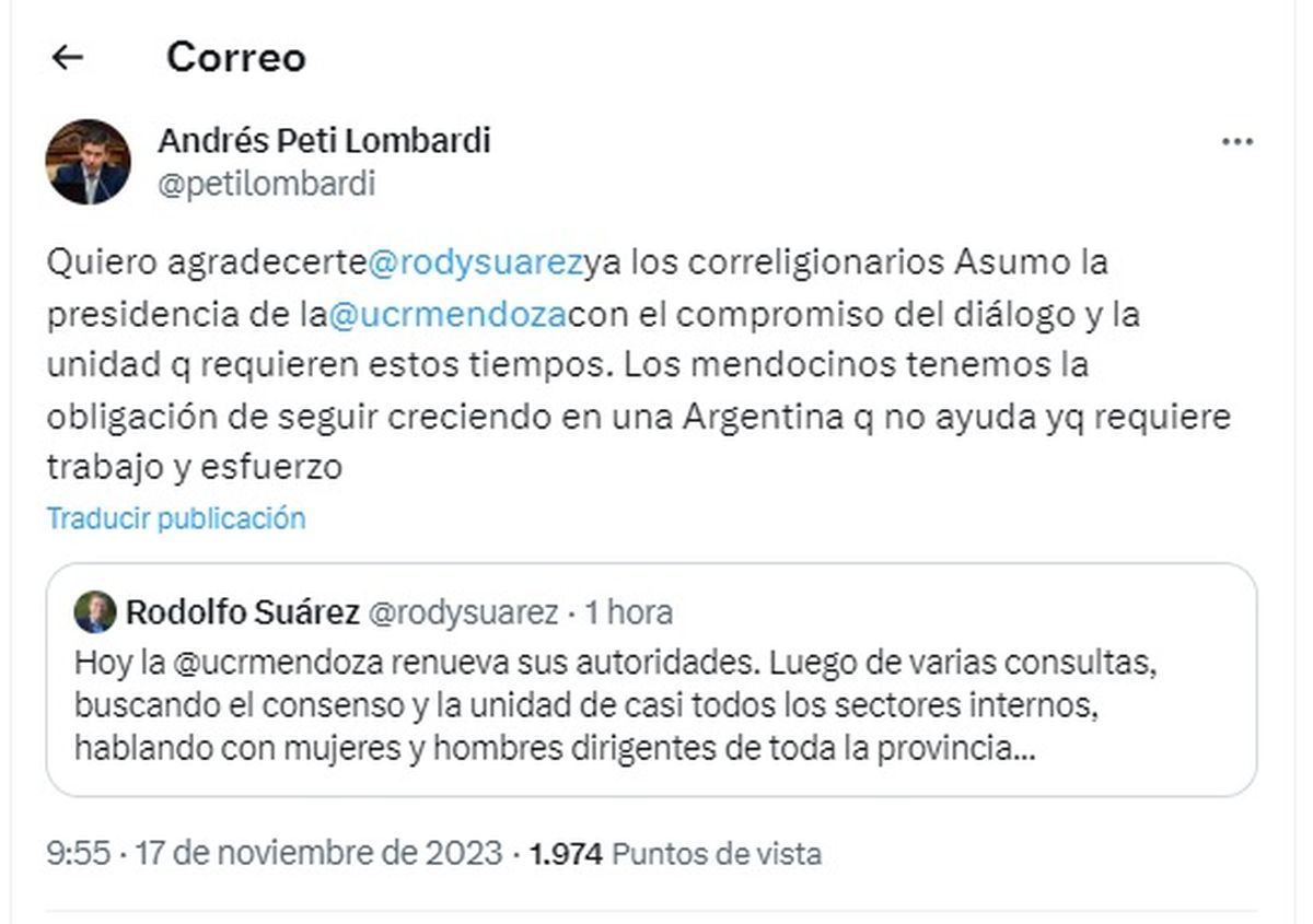 El Gobernador Rodolfo Suarez anunció que la UCR mendocina ya tiene nuevo presidente, se trata de Andrés "Peti" Lombardi, quien desde fines del 2019 -es decir, desde que Rodolfo Suarez asumió la gobernación de Mendoza- se encuentra frente a la Cámara de Diputados de la provincia.