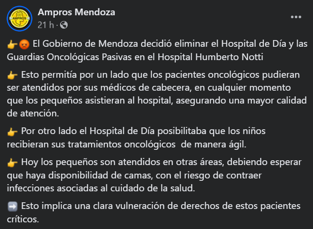 La Asociación Mendocina de Profesionales de la Salud (AMPROS) emitió un comunicado este domingo en Facebook asegurando -ahora desmentido por el director general de Hospitales Jorge Pérez- que el Gobierno decidió eliminar el Hospital de Día y las Guardias Oncológicas Pasivas en el Hospital Humberto Notti.