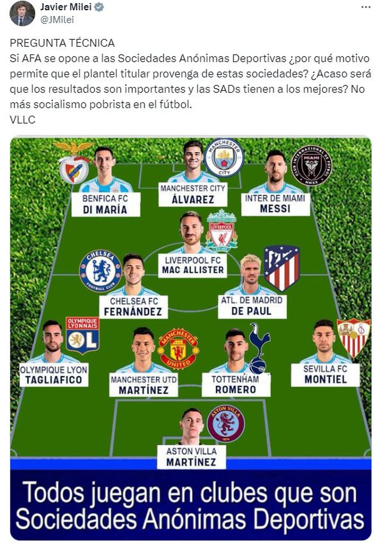 “Pregunta técnica. Si AFA se opone a las Sociedades Anónimas Deportivas, ¿por qué motivo permite que el plantel titular provenga de estas sociedades? ¿Acaso será que los resultados son importantes y las SADs tienen a los mejores? No más socialismo pobrista en el fútbol”, argumentó en su cuenta de X.