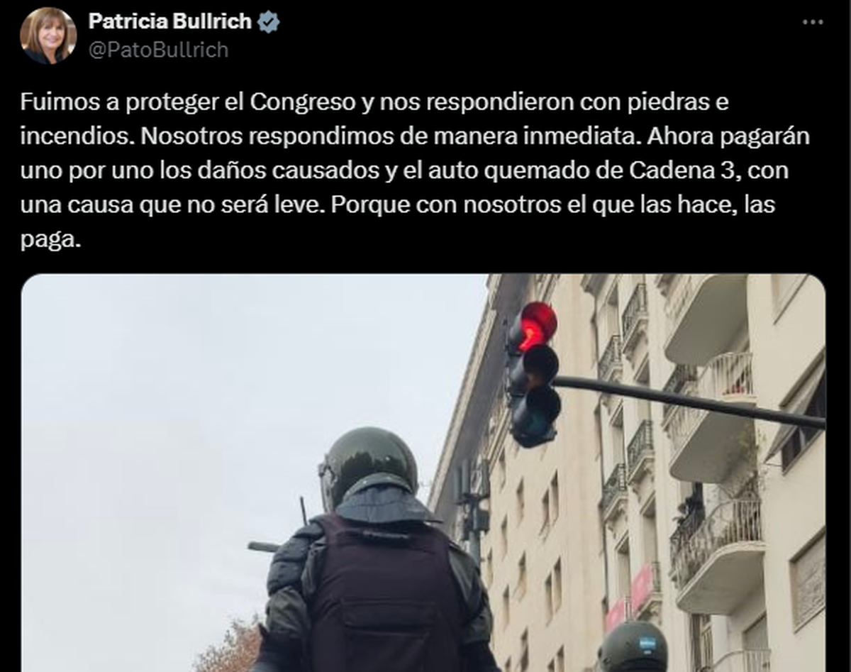 "Fuimos a proteger el Congreso y nos respondieron con piedras e incendios. Nosotros respondimos de manera inmediata. Ahora pagarán uno por uno los daños causados y el auto quemado de Cadena 3, con una causa que no será leve. Porque con nosotros el que las hace, las paga", sentenció Bullrich.