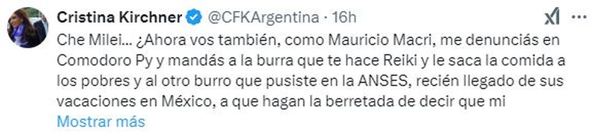 - "Que te cuente el burro de ANSES lo que hice con la sentencia que no sólo reconoció mi derecho a las pensiones como ex presidenta y como viuda de un ex presidente, sino también el retroactivo más sus intereses por todo lo que no había percibido durante los años de la gestión macrista que me las había quitado y, además, me eximió de pagar el Impuesto a las Ganancias ordenando la devolución de las sumas descontadas por ese concepto con más sus intereses".