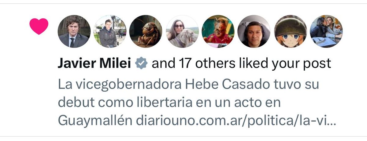 El presidente Javier Milei le dio un corazón a la publicación en X de diario UNO sobre la presentación de la vicegobernadora Hebe Casado en Guaymallén, ya en las filas de la Libertad Avanza, su partido. Casado, como la ministra de Seguridad, Patricia Bullrich se pasaron del PRO a las filas de los libertarios, hace un par de días en pleno proceso electoral y a días de las elecciones legislativas en la Ciudad de Buenos Aires.