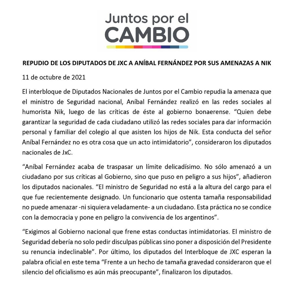 “Exigimos al Gobierno Nacional que se exprese sobre lo ocurrido y que garantice que los miembros de su gabinete cumplan con los deberes de funcionarios públicos que les fueron asignados. El ministro de Seguridad debería pedir verdaderas disculpas sobre lo sucedido y poner su renuncia a disposición del señor Presidente de la Nación para que sea él quien tome la decisión de sostener en el cargo a funcionarios que no son capaces de hacerle honor a sus responsabilidades”, afirmó la mesa nacional de Juntos por el Cambio.
