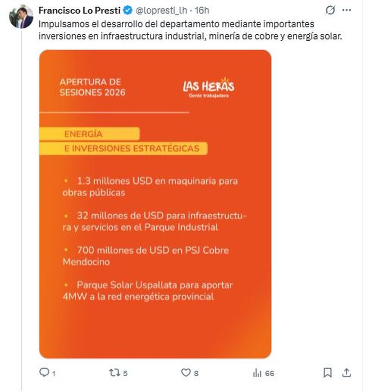 En el discurso detalló que las diversas empresas que se instalaron en Las Heras, fundamentalmente con proyectos mineros y energéticos, sumaron más de U$S 1.000 millones.