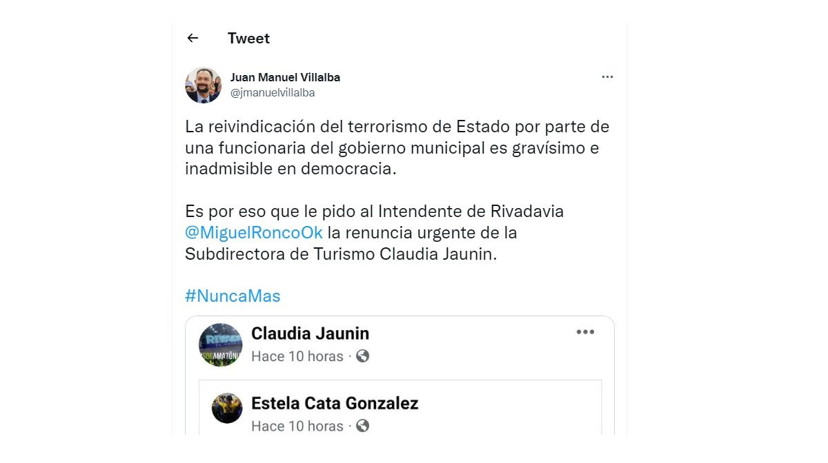 El hecho se transformó en un escándalo durante el fin de semana. La publicación fue advertida por un concejal del departamento, Juan Manuel Villalba (FdT), quien de inmediato le solicitó a Ronco la renuncia de la funcionaria. Más tarde, se sumaron a él otros referentes de la coalición opositora, y pidieron sanciones en el mismo sentido para Jaunin.