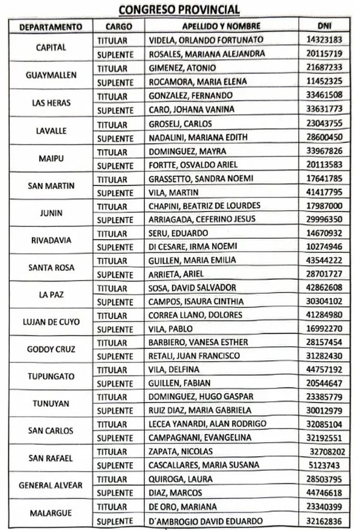 Los congresales, en tanto, son los siguientes por departamento: