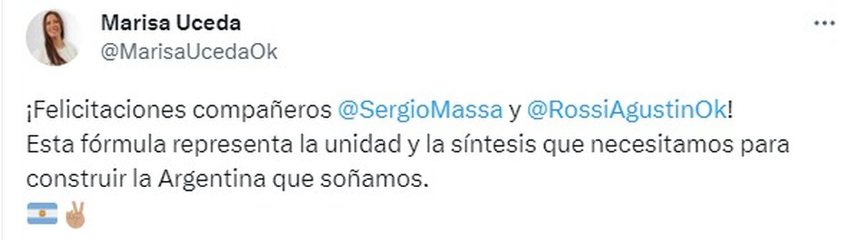 A su turno, la abogada y diputada nacional Marisa Uceda se refirió a una fórmula de "síntesis", aunque ni Massa ni Rosi se alinean incondicionalmente con el peronismo K en su subvariante cristinista.