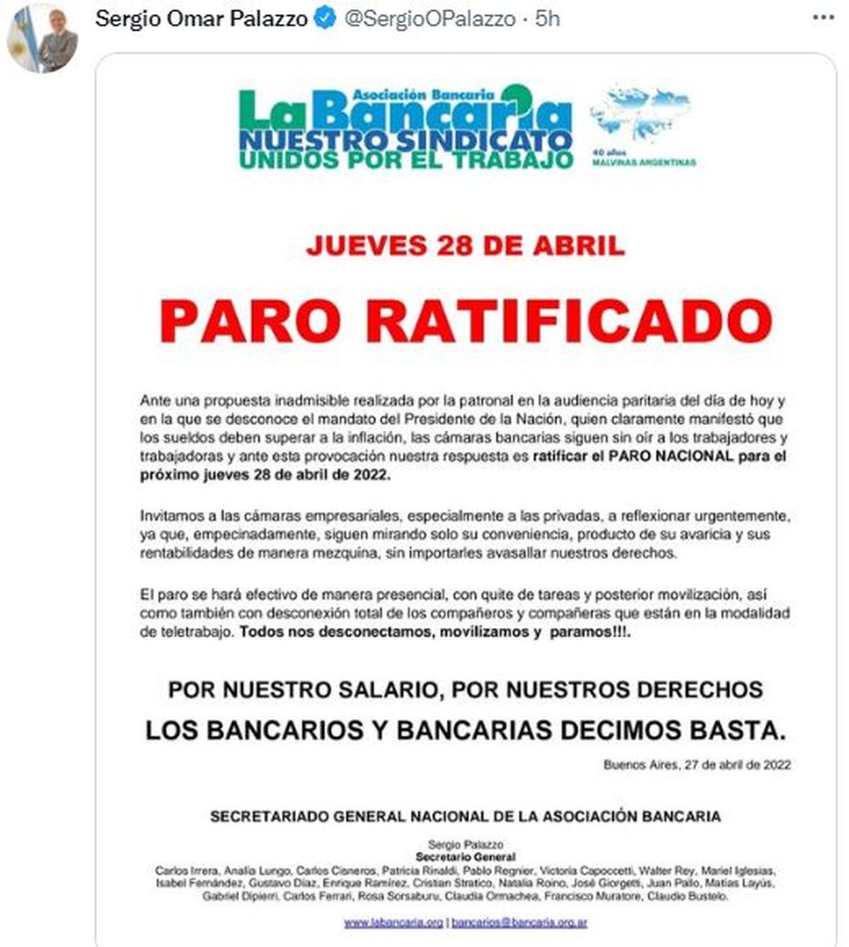 Palazzo y Bustelo convocaron a la huelga con "desconexión, movilización y protestas en defensa del salario y los derechos laborales, porque los bancarios dicen basta".