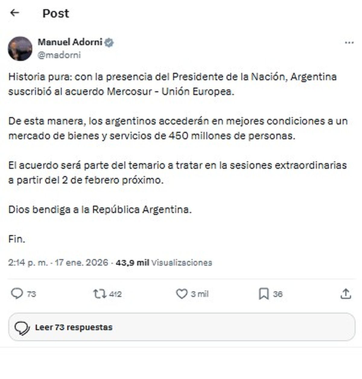 “El acuerdo establece mecanismos que podrían restringir el acceso, como salvaguardas, cuotas o medidas de efecto equivalente. Esos instrumentos, si se aplican, reducirán el impacto económico del acuerdo y atentará contra el objetivo esencial del mismo, por eso tenemos que velar en nuestros parlamentos para que esto no ocurra. Los 25 años invertidos nos obligan a estar a la altura en esta última etapa”, reclamó el presidente Javier Milei.
