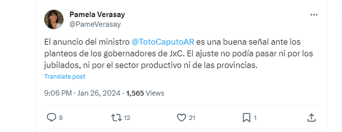 Se produjo, además, al cabo de una semana en la que le gestión de Milei logró aprobar el dictamen de mayoría de la Ley Ómnibus en Diputados y en la que el ministro de Economía presionó fuerte a los gobernadores en la búsqueda de la aprobación de la norma la semana que viene en el recinto.