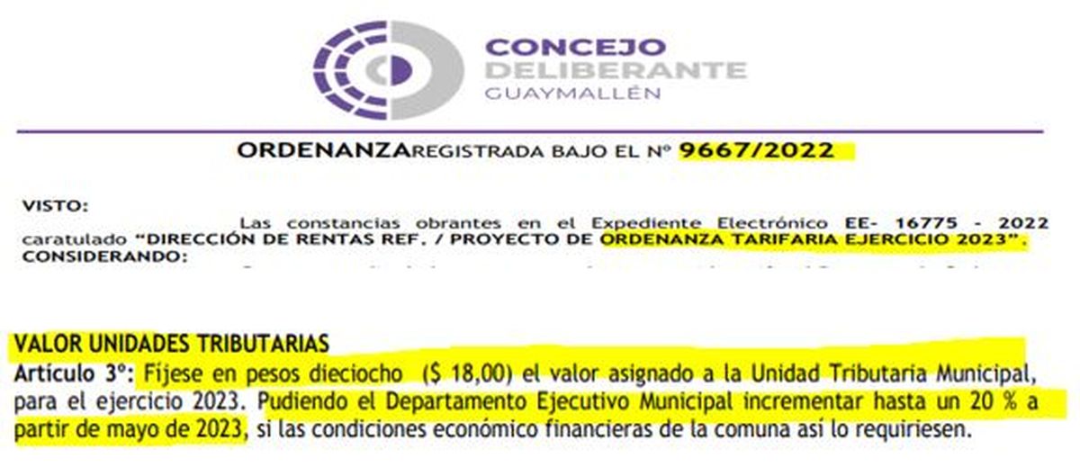 "Recientemente se estableció un nuevo aumento en las tasas y derechos municipales, elevando el valor de la Unidad Tributaria Municipal desde los $11,40 actuales a $18 a partir de enero de 2023, alcanzando así el 57,89% de aumento inmediato (mes a mes), el 445,45% desde que la alianza conformada entre a UCR y el PRO inició su segundo mandato a nivel local y casi el 2000% desde el mes de diciembre de 2015".