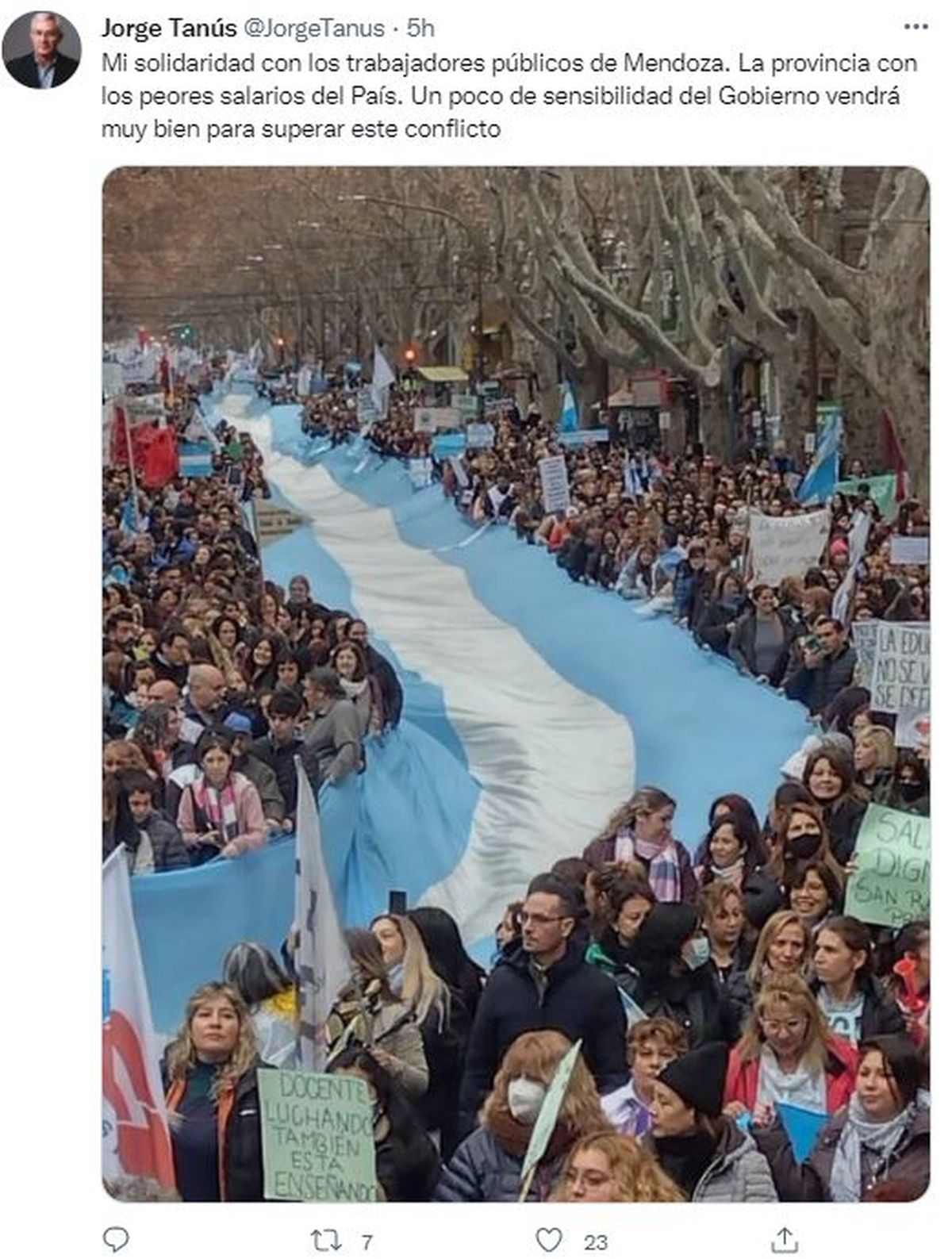 Otra diputada nacional, la sanrafaelina Liliana Paponet, dijo: "¡Paro docente con histórico acatamiento en nuestra provincia, exigiéndole al gobernador Rodolfo Suarez mejoras salariales ya! ¡Acompañemos la lucha! Debemos ponerle fin a la Mendoza de la precarización y de los salarios más bajos del país".