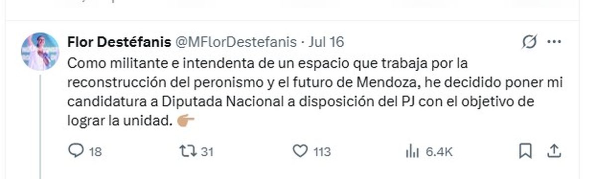 La señal la dio Destéfanis el 16 de julio, cuando publicó en cuenta de X que ponía su candidatura a diputada nacional a disposición del PJ para "lograr la unidad".