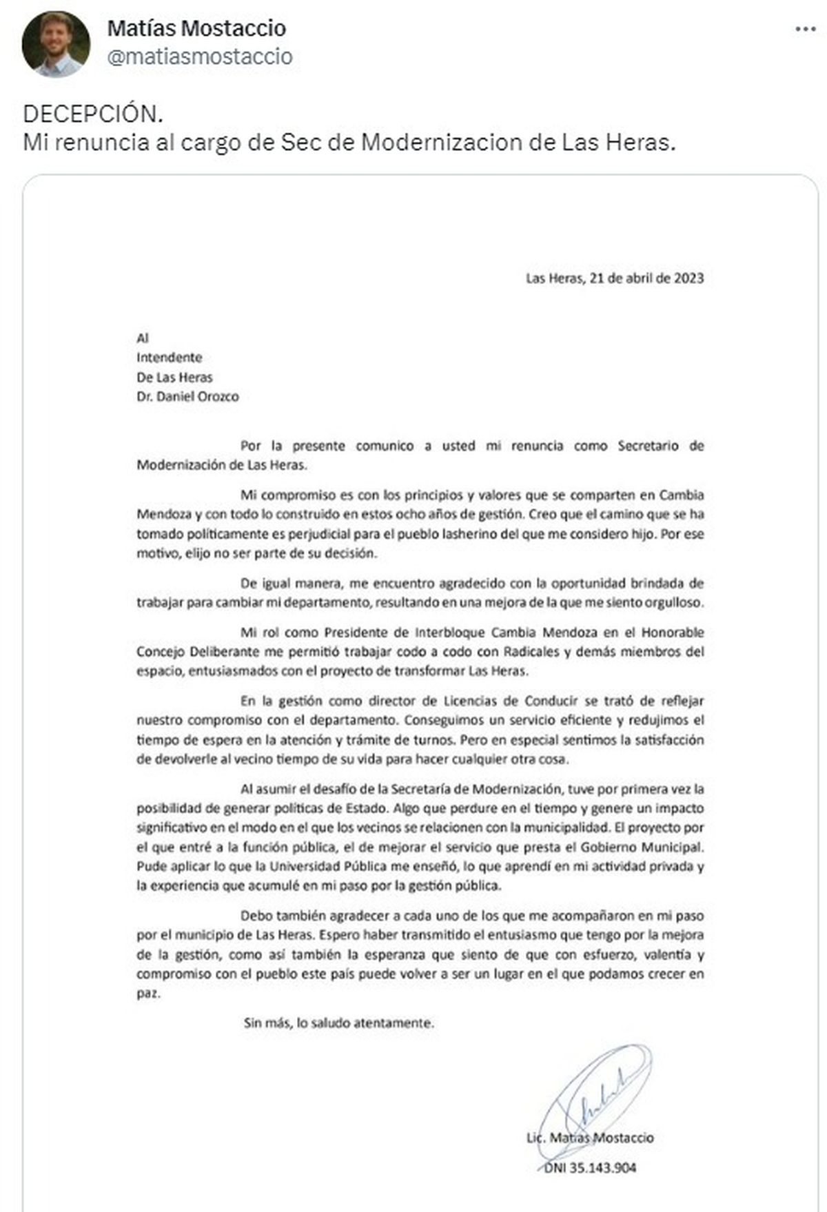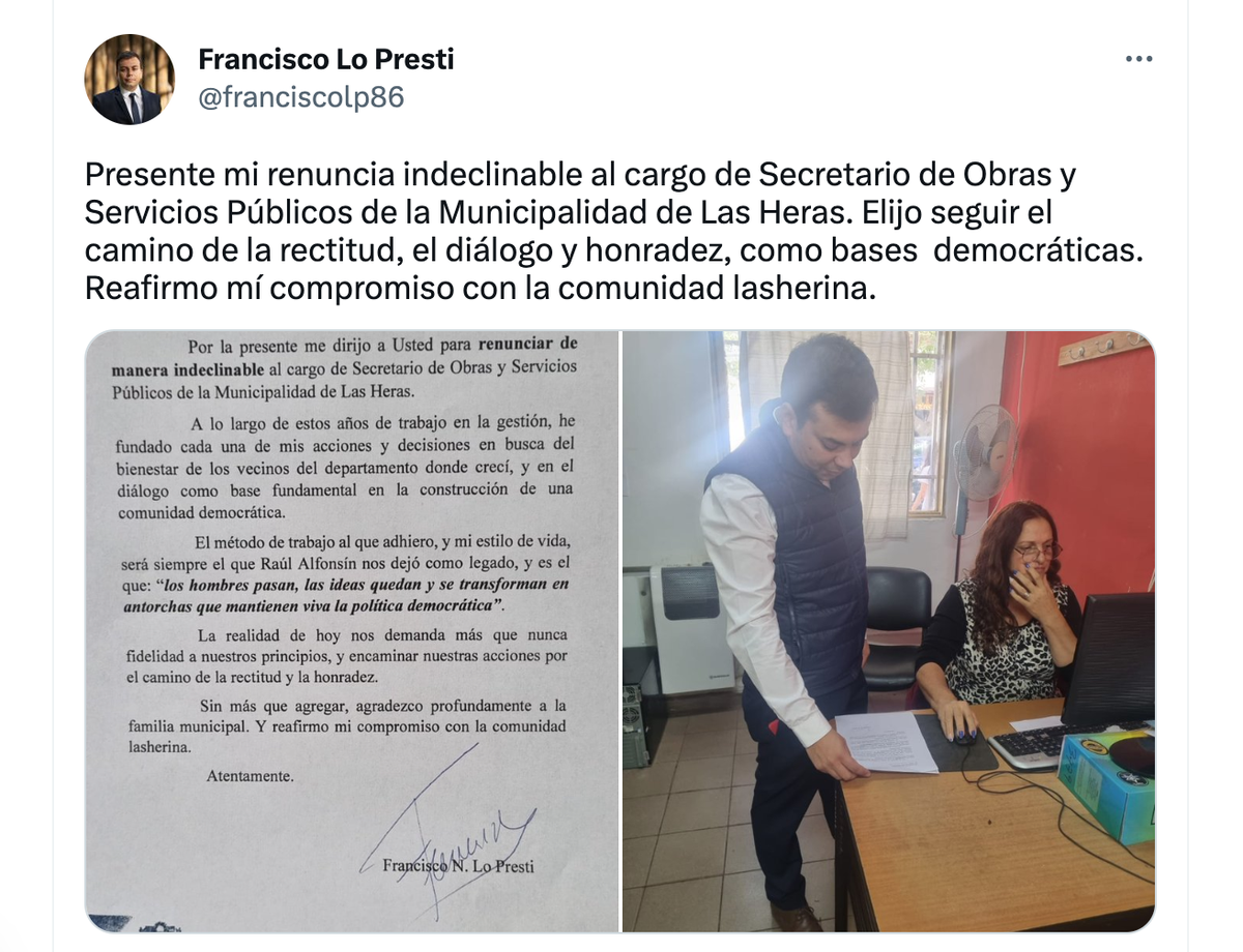 Ahora, Mostaccio publicó su renuncia bajo el título de "Decepción" y argumentó: "Mi compromiso es con los principios y valores que se comparten en Cambia Mendoza y con todo lo construido en estos 8 años de gestión. Creo que el camino que se ha tomado políticamente es perjudicial para el pueblo lasherino, del que me siento hijo".