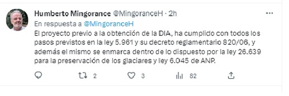 En un hilo de Twitter explicó que la obtención de la DIA no solo se enmarca en los requisitos de la 7722, sino además en las legislaciones ambientales correspondientes, la que más se destaca es la 26.639, de Preservación de Glaciares.