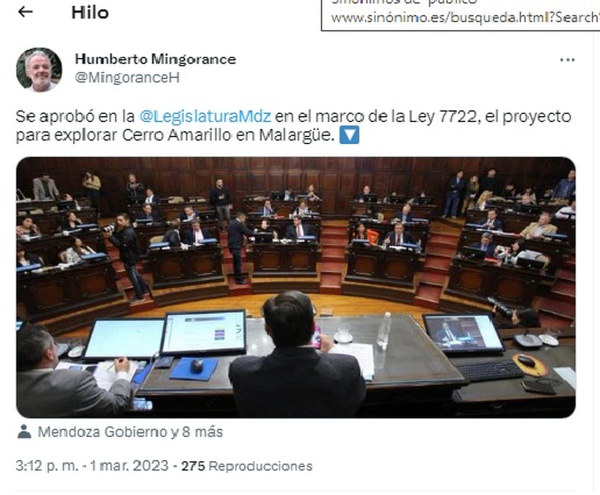 El secretario de Ambiente y Ordenamiento Territorial de la Provincia, Humberto Mingorance, publicó en su cuenta de Twitter que se aprobó con todos los requisitos que indican las leyes la DIA para explorar Cerro Amarillo