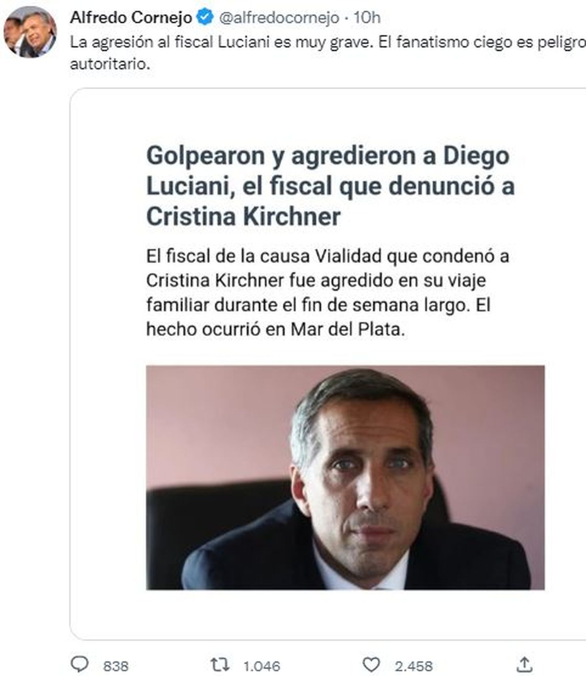 El senador nacional Alfredo Cornejo expresó: "La agresión al fiscal Luciani es muy grave. El fanatismo ciego es peligroso y autoritario". El ex gobernador acompañó su publicación con una imagen en la que responsabiliza al kirchnerismo por lo sucedido.
