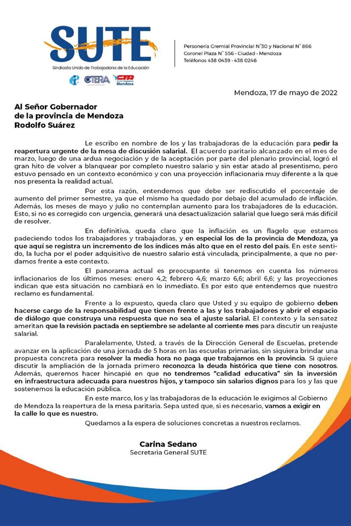 En una carta abierta dirigida al gobernador Rodolfo Suarez, la secretaría general del SUTE, Carina Sedano, solicitó de manera urgente la reapertura de paritarias para actualizar el salario de todos los trabajadores de la educación.