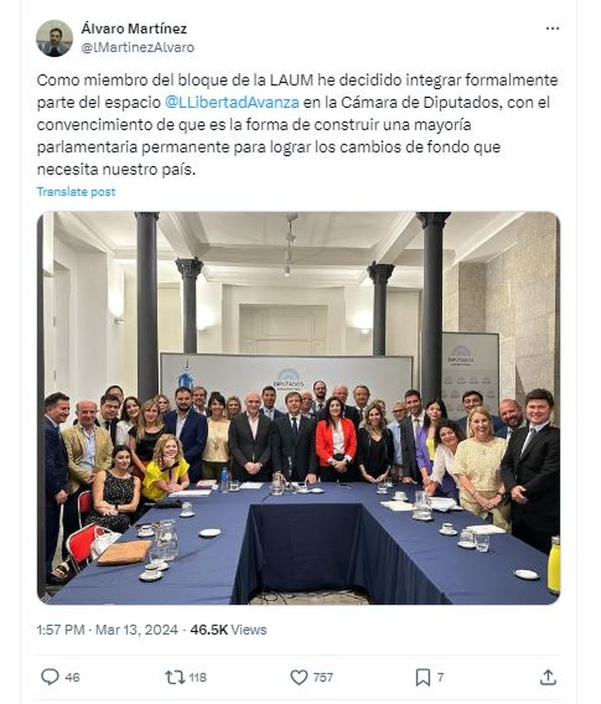 "Yo venía teniendo una participación activa en la militancia de varios temas como la Ley de bases y soy de los que piensa que no hay tiempo ni lugar para tibios ni tímidos. Por eso decidí formalmente integrar el bloque de La Libertad Avanza porque creo que debemos fortalecer el bloque de Diputados para encarar lo que viene", se sinceró Martínez.