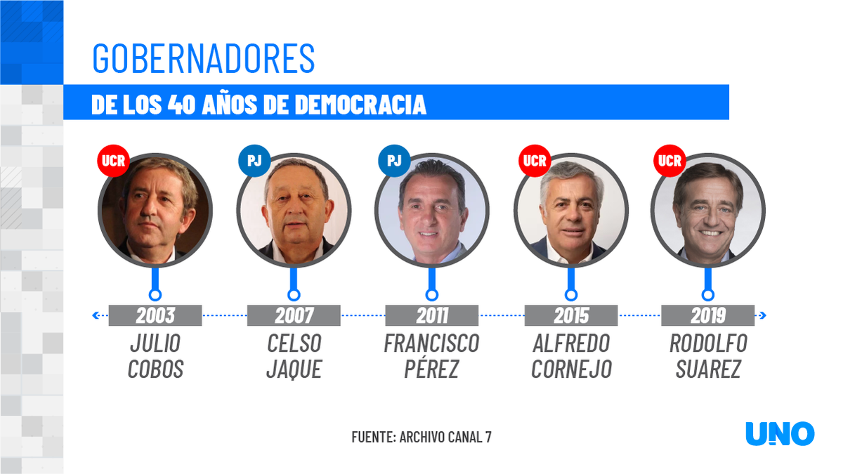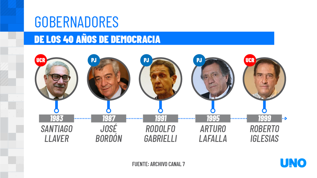 En cuatro décadas, el justicialismo logró 5 gobernadores y la UCR otros 5. Fueron Santiago Felipe Llaver (UCR, 1983) - José Octavio Bordón (PJ, 1987) - Rodolfo Gabrielli (PJ, 1991) - Arturo Lafalla (PJ, 1995) - Roberto Iglesias (UCR, 1999) - Julio Cobos (UCR, 2003), Celso Jaque (PJ, 2007), Francisco Pérez (PJ, 2011), Alfredo Cornejo (UCR, 2015) y Rodolfo Suarez (UCR, 2019).