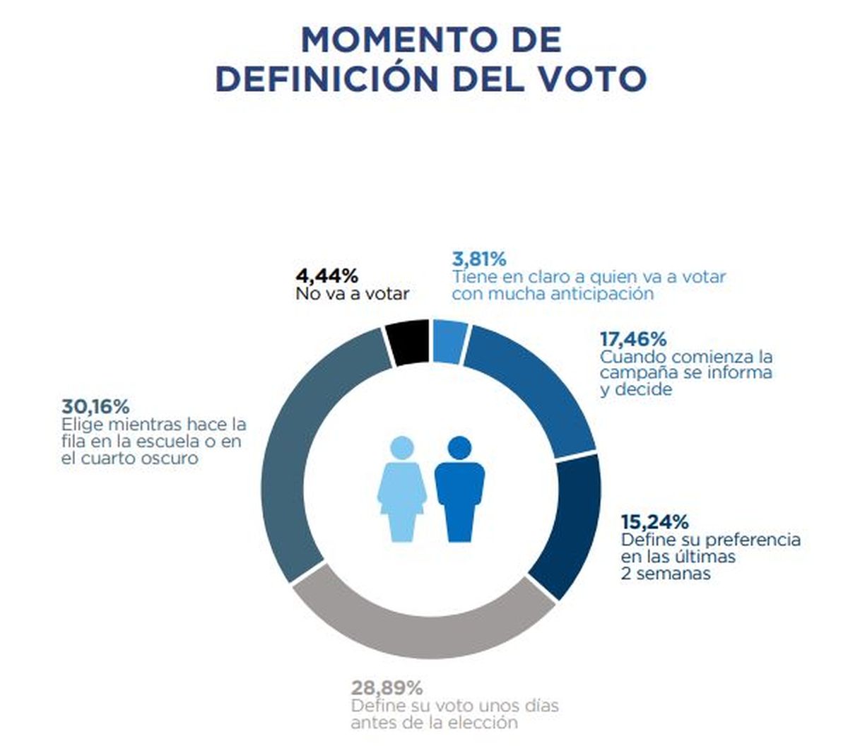 De esos encuestados 30,16% confirmó que define su voto en la fila o dentro del cuarto oscuro y 28,89% asumió que se decide a quien votará sólo unos días antes de la elección. En tanto que 15,24% contó que se define en las últimas dos semanas previas a los comicios.