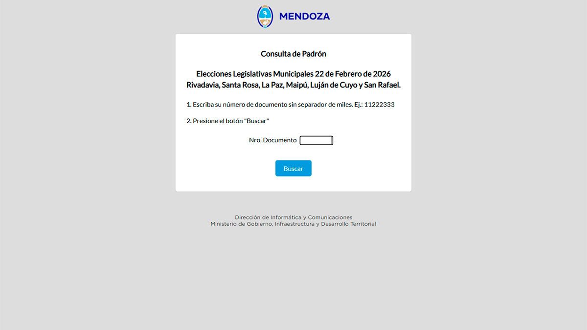 Para saber donde votar en las elecciones del domingo 22 de febrero en Mendoza ya podés consultar el lugar exacto en el sitio oficial de la Junta Electoral de la provincia: padron.mendoza.gov.ar. El sistema permite consultar los siguientes datos: