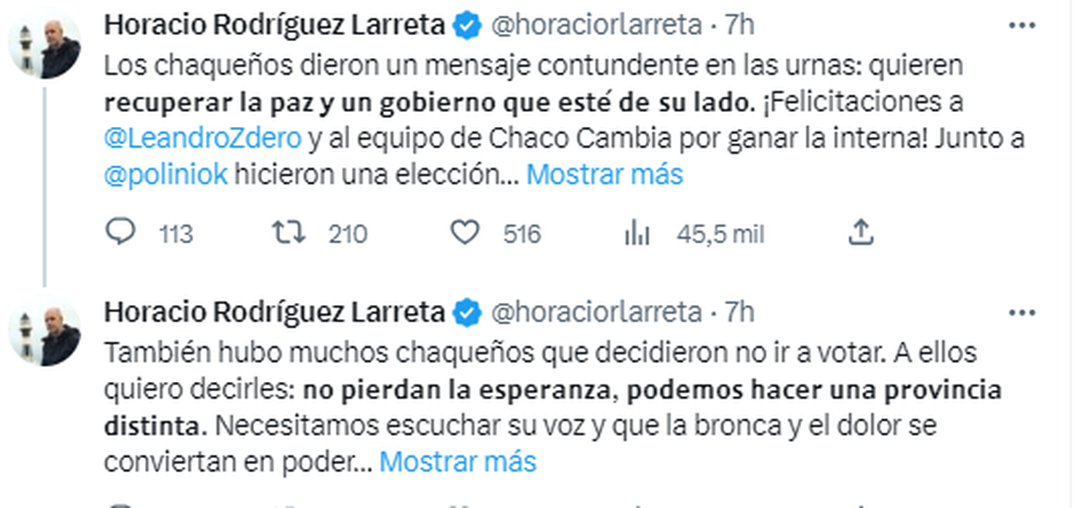 En tanto, el mandatario provincial, en fórmula con Analía Rach Quiroga, obtenía el 36% de los votos, arrasando en su propia interna del Frente Chaqueño, que también tenía en la cancha a Ismael Walter Espinoza como precandidato a gobernador y Cepriano Arizaga a vice, que alcanzaban el 0,25%.