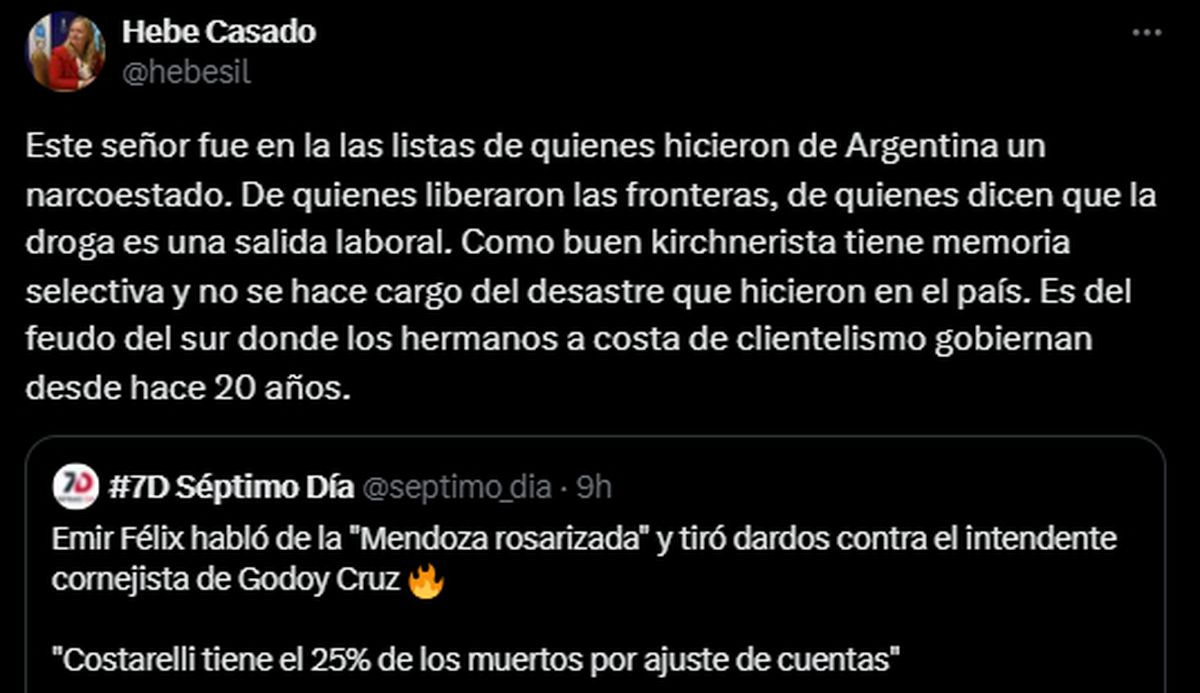 Sabido es que el ex intendente de San Rafael Emir Félix no está entre los favoritos de la vicegobernadora Hebe Casado. La también sanrafaelina aprovechó la aparición del mayor de los Félix para criticarlo una vez más, esta vez, por redes sociales.