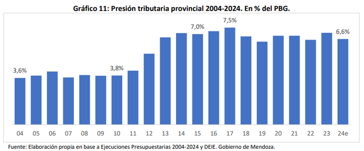Según el análisis del CEM, el gasto público creciente derivó en un fuerte aumento de la presión impositiva provincial (ingresos tributarios/PBG), que pasó del 3,6% en 2004 al 7% del PBG en 2015 y a 7,5% en 2017.