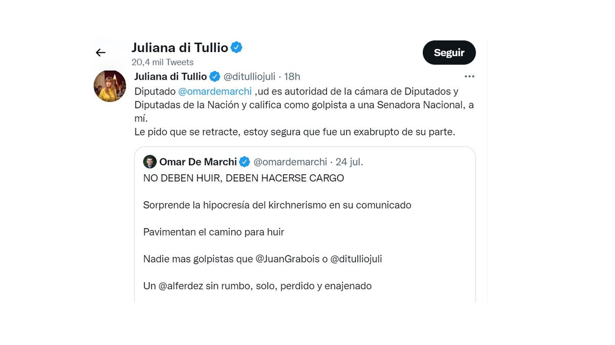 "Nadie más golpista que Juliana Di Tullio y Juan Grabois", escribió Omar De Marchi en su cuenta de Twitter. A la senadora la alusión no le gustó para nada y le pidió al mendocino que se retractara de sus dichos. En medio de la crisis, los legisladores nacionales canalizaron un nuevo episodio de la grieta política del país, mientras las acusaciones de "golpismo" crecen de un bando hacia el otro. Los últimos cruces entre Gobierno y oposición siguen enturbiando las posibilidades de diálogo.