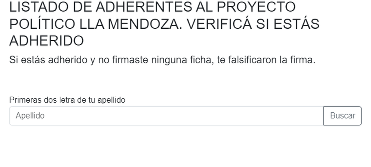 "Verificá si estás adherido", reza la página. "Si estás adherido y no firmaste ninguna ficha, te falsificaron la firma", informa antes de dar paso a la posibilidad de búsqueda con las primeras dos letras del apellido.