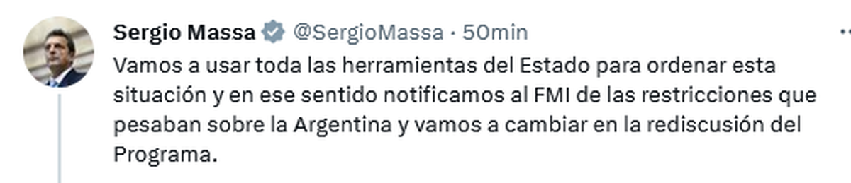 "Hace varios días que vivimos una situación atípica de rumores, versiones, falsos informes y su consecuente impacto en los instrumentos financieros vinculados al dólar", afirmó Massa en su cuenta de Twitter.