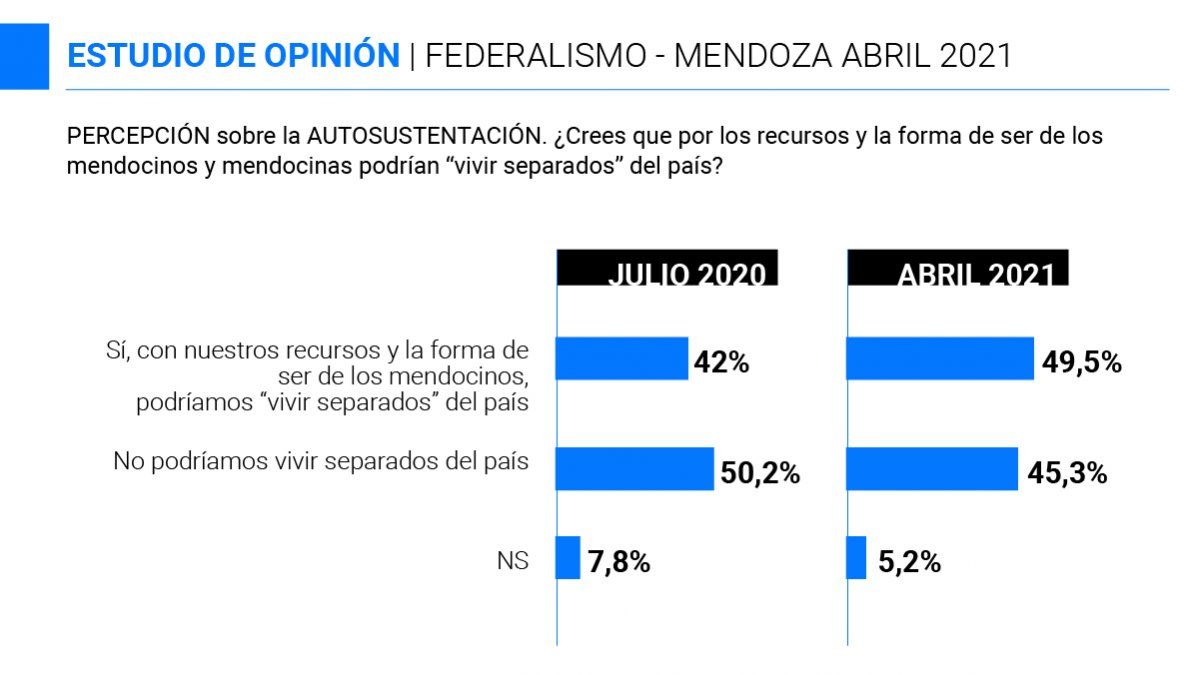 Según concluye el sondeo, de esa medición aparecen "luces amarillas, que apuntan a una animadversión en ascenso de una porción cada vez más significativa de mendocinos, contra el Estado Nacional. Dicha discordancia, se traduce en insatisfacción por una provincia que debe ‘mendigar’, lo que consideran que le es propio. Vinculado a ese malestar cada vez menos solapado, la percepción de autosustentación escaló más de 7 puntos, respecto del año anterior. Es decir, aunque ‘objetivamente’ la provincia no pueda vivir sin las remesas que envía la Nación, casi el 50% de los encuestados cree que Mendoza podría sobrevivir sólo con sus propios recursos, contra un 42% que así lo sindicaba el año pasado".