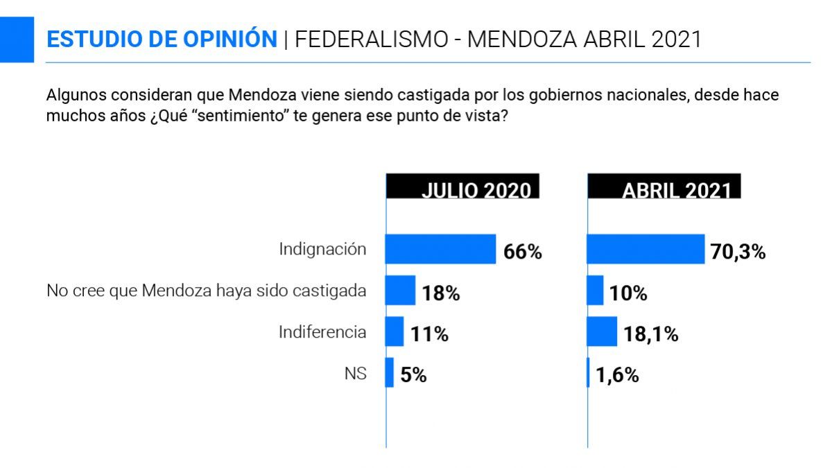 "En los mendocinos anida una frustración contenida en torno a la redistribución de los recursos. Ello deriva en que un 70,3% de los encuestados se anote entre los indignados por lo que consideran un castigo sistemático a Mendoza con raigambre en aquella polémica promoción industrial de la época del proceso militar, que marginó a la provincia. Dicha frustración se incrementó 4,3%, respecto de julio pasado", sostienen los encuestadores, comparando los resultados con lo que midieron también a mediados del año pasado, cuando comenzó a hablarse de este movimiento separatista.