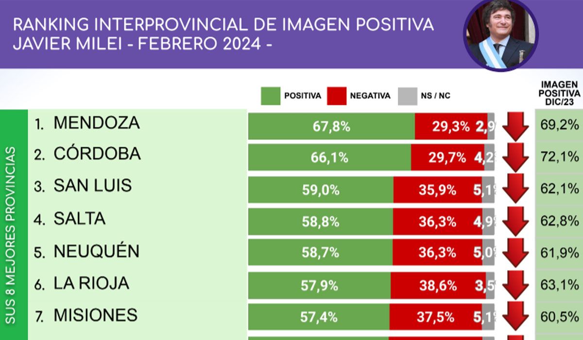 La imagen de Javier Milei, en tanto, cayó en todas las provincias; pero a la más alta la encuentra en Mendoza.