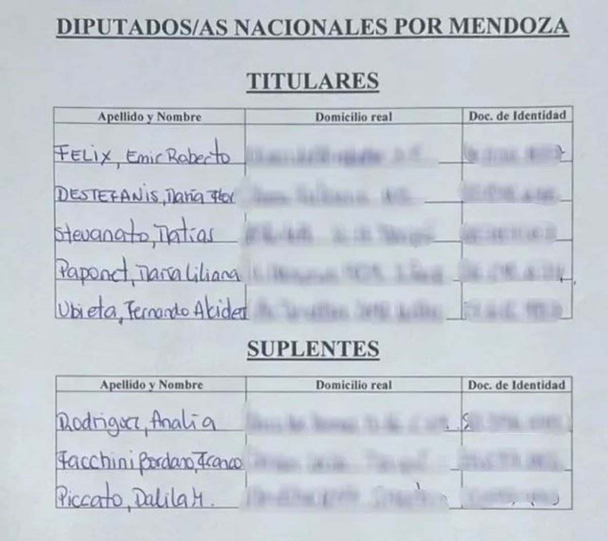 En primer lugar está Emir, actual presidente del partido, la intendenta de Santa Rosa, Flor Destéfanis, en segundo lugar, y en tercer puesto el jefe comunal de Maipú, Matías Stevanato. El cuarto lugar es para la actual diputada nacional Liliana Paponet, del círculo de los hermanos Félix, y en quinto lugar figura el intendente de La Paz, Fernando Ubieta.