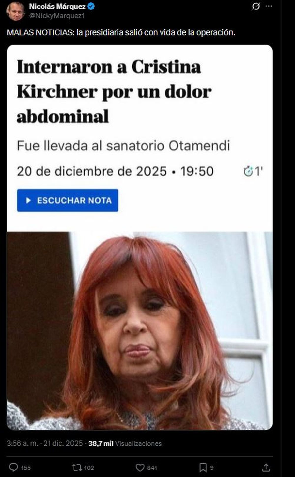 “MALAS NOTICIAS: la presidiaria salió con vida de la operación”, escribió Márquez, en un mensaje acompañado por un recorte de diario que indicaba: “Internaron a Cristina Kirchner por un dolor abdominal”.