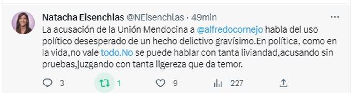 Dijo la legisladora: "La acusación de la Unión Mendocina a Alfredo Cornejo habla del uso político desesperado de un hecho delictivo gravísimo.En política, como en la vida,no vale todo. No se puede hablar con tanta liviandad,acusando sin pruebas,juzgando con tanta ligereza que da temor".