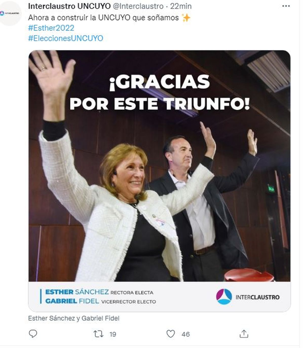 Sánchez y Fidel representaron a Interclaustro, un espacio que si bien se presenta como independiente es afín a la Unión Cívica Radical. Es la agrupación que gestiona la universidad actualmente y en esta elecciones está claro que la UCR avanzó varios casilleros, ya que tanto Sánchez como su vice, Gabriel Fidel, tienen vínculos con el radicalismo. En la fórmula anterior, en cambio, Barón representaba un matiz, ya que se autodefinía como "independiente".