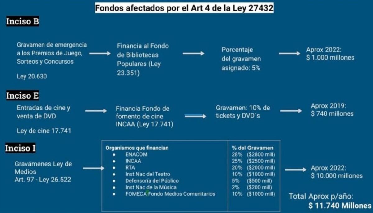 Esas entidades funcionan a partir del aporte de algunos impuestos que están especificados en la ley 27.432, como por ejemplo los gravámenes a ciertos juegos de azar y concursos deportivos. O sea que, en rigor, no salen del núcleo del Presupuesto Nacional.