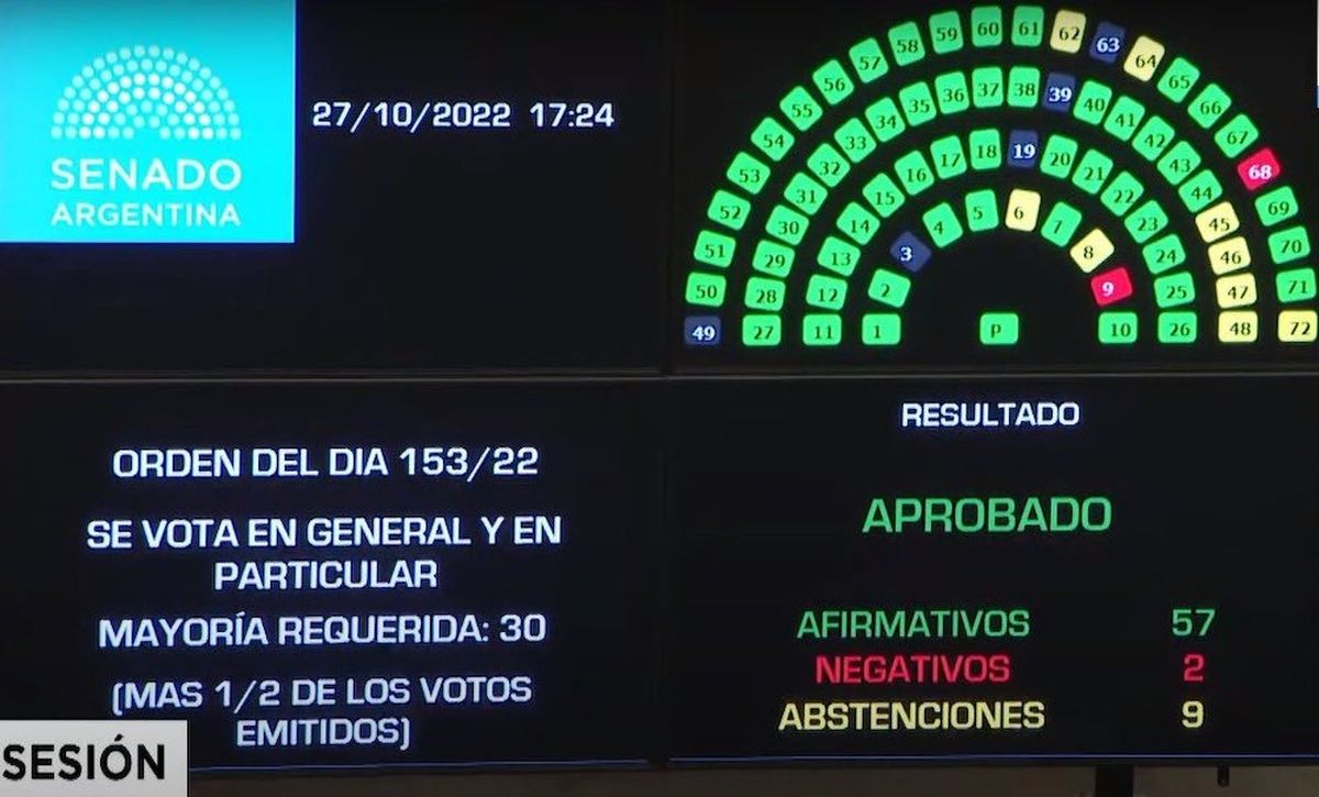 En la siguiente imagen puede verse la abrumadora mayoría con la que fue aprobado el proyecto, que contó con 57 votos a favor, 2 negativos y 9 abstenciones: