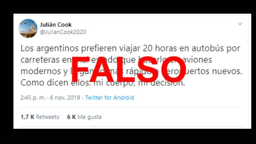 La cuenta @JulianCook2020 publicó un tuit que dice: “Los argentinos prefieren viajar 20 horas en autobús por carreteras en mal estado que hacerlo en aviones modernos y llegando más rápido a aeropuertos nuevos. Como dicen ellos: mi cuerpo, mi decisión” (sic). La publicación se produjo el mismo día en que se supo que el ex CEO y fundador de la aerolínea de bajo costo Flybondi, Julian Cook, abandonará el país, a raíz de la victoria de Alberto Fernández (Frente de Todos). Reverso pudo comprobar que el tuit y esa cuenta de Twitter son falsos.