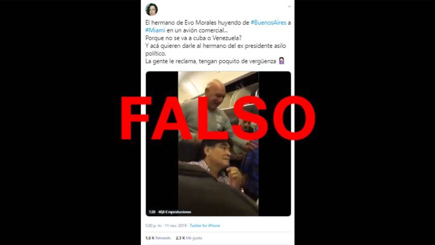 “El hermano de Evo Morales huyendo de #BuenosAires a #Miami en un avión comercial”, se lee en una de las entradas que circulan en Twitter (1, 2, 3 y 4) y en Facebook (1, 2 y 3). Las imágenes también circulan en distintos sitios web (1, 2 y 3) que afirman que se trata del hermano de quien hasta el 10 de noviembre último era el presidente de Bolivia.