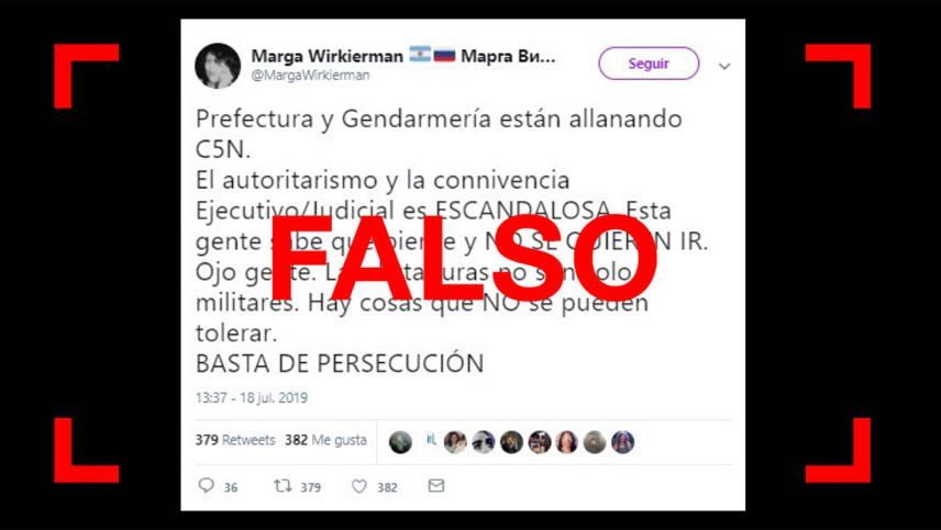 El jueves último, circularon en Twitter mensajes que advertían sobre un allanamiento en el canal de televisión C5N, en buena parte con el hashtag #AprieteAC5N. Un usuario publicó un mensaje en la red social -luego eliminado sin seguir las mejores prácticas para detener la difusión de una desinformación-, donde dijo textualmente: “Prefectura y Gendarmería están allanando C5N. El autoritarismo y la connivencia Ejecutivo/Judicial es ENCANDALOSA. Esta gente sabe que pierde y NO SE QUIEREN IR. Ojo gente. Las dictaduras no son solo militares. Hay cosas que NO se pueden tolerar. BASTA DE PERSECUCIÓN”. La ministra de Seguridad de la Nación, Patricia Bullrich, lo desmintió con un mensaje que tuvo más de 2 mil retuits.